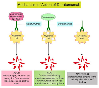 Η δαρατουμουμάμπη είναι το πρώτο μονοκλωνικό αντίσωμα (mAb) με στόχο την CD38 που εγκρίνεται στην Ευρώπη. Το φάρμακο δρα μέσω σύνδεσης με την CD38, ένα μόριο σηματοδότησης με υψηλή έκφραση στην επιφάνεια των κυττάρων του πολλαπλού μυελώματος ανεξάρτητα από το στάδιο της νόσου. Με αυτό τον τρόπο, η δαρατουμουμάμπη κινητοποιεί το ανοσιακό σύστημα του ασθενούς σε επίθεση κατά των καρκινικών κυττάρων, με αποτέλεσμα τον γρήγορο θάνατο των καρκινικών κυττάρων μέσω πολλαπλών, ανοσοδιαμεσολαβούμενων μηχανισμών δράσης και μέσω ανοσοτροποποιητικών επιδράσεων, σε συνδυασμό με τον άμεσο θάνατο των καρκινικών κυττάρων μέσω απόπτωσης (προγραμματισμένος κυτταρικός θάνατος).