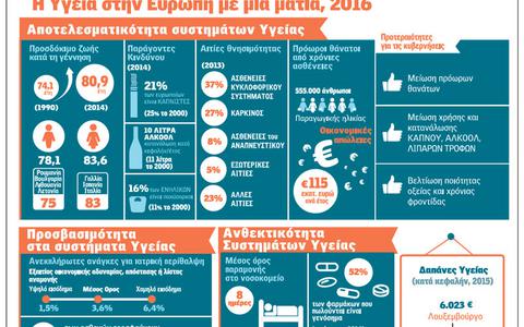 Χρειαζόμαστε πιο ανθεκτικά συστήματα υγείας: Σε ολόκληρη την ΕΕ, το ποσοστό του πληθυσμού άνω των 65 ετών αυξήθηκε από κάτω του από 10 % το 1960 σε σχεδόν 20 % το 2015, και προβλέπεται να αυξηθεί σε περίπου 30 % έως το 2060. Η γήρανση του πληθυσμού, σε συνδυασμό με τα αυξανόμενα ποσοστά χρόνιων παθήσεων και τους δημοσιονομικούς περιορισμούς, θα καταστήσει αναγκαία την πραγματοποίηση αλλαγών στον τρόπο παροχής της υγειονομικής περίθαλψης, όπως είναι η ανάπτυξη της ηλεκτρονικής υγείας (eHealth), η μείωση της παραμονής στο νοσοκομείο μέσω της καλύτερης οργάνωσης υπηρεσιών όσον αφορά την πρωτοβάθμια και την κατ’ οίκον περίθαλψη, και οι συνετότερες δαπάνες για φάρμακα, μεταξύ άλλων μέσα από την πλήρη αξιοποίηση των ευκαιριών για αντικατάσταση με γενόσημα. Η έκθεση «Η υγεία με μια ματιά: Ευρώπη 2016» παρουσιάζει τις πιο πρόσφατες τάσεις στην υγεία και τα συστήματα υγείας στα 28 κράτη μέλη της ΕΕ, στις 5 υποψήφιες προς ένταξη χώρες και σε 3 χώρες της Ευρωπαϊκής Ζώνης Ελευθέρων Συναλλαγών. Είναι το αποτέλεσμα μιας ενισχυμένης συνεργασίας μεταξύ του ΟΟΣΑ και της Ευρωπαϊκής Επιτροπής με στόχο τη βελτίωση της πληροφόρησης σε θέματα υγείας κατά χώρα και σε επίπεδο ΕΕ, στο πλαίσιο του νέου κύκλου της πρωτοβουλίας «Κατάσταση της υγείας στην ΕΕ».