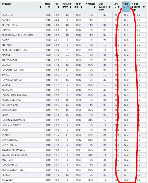 Στην υπόλοιπη Ελλάδα, σε πολλές περιοχές καταγράφηκαν θερμοκρασίες κοντά στους 43-44°C και τοπικά 45°C, που αλλού, στη Λάρισα!