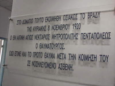 Αμέσως μετά την κοίμησή του Αγίου Νεκταρίου, εκδηλώθηκε το πρώτο από μια σειρά θαυμάτων του στο νοσοκομείο μας. Κατά την αλλαγή του ιερού λειψάνου, η μοναχή Ευφημία τοποθέτησε τη φανέλα του αγίου στο κρεβάτι του παραπληγικού, ο οποίος αιφνίδια σηκώθηκε και άρχισε να βηματίζει ελεύθερα