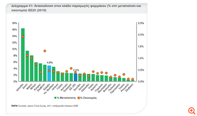 Όπως αναφέρεται στη μελέτη, το 2016 οι απασχολούμενοι στον κλάδο παραγωγής φαρμάκων αντιστοιχούσαν στο 0,5% της συνολικής απασχόλησης στην ελληνική οικονομία, αποτελώντας το 4,9% της απασχόλησης στον κλάδο της μεταποίησης,ποσοστό υψηλότερο από το μέσο όρο της ΕΕ25 (2,5%).