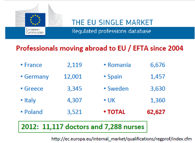 Παράλληλα παρατηρήθηκε έξαρση του φαινομένου της κινητικότητας επαγγελματιών και ειδικότερα ιατρών εκτός της πατρίδας τους τα τελευταία χρόνια , ως αποτέλεσμα της οικονομικής κρίσης των οικονομικά αδύνατων χωρών και του πληθωρισμού στο ιατρικό δυναμικό μιας χώρας, όπως φαίνεται στην διαφάνεια από τη EUROSTAT