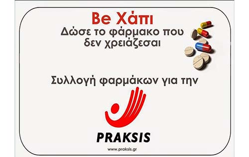 Τα φαρμακεία μας σε Αθήνα και Θεσσαλονίκη, ήταν ανέκαθεν ζωντανά χάρη τις δωρεές φαρμάκων ή την οικονομική συμβολή των συνανθρώπων μας –μικρή ή μεγάλη- αυτή η συμβολή είναι πάντα πολύτιμη για να μπορεί ο πυρήνας της PRAKSIS –το φαρμακείο-να παρέχει άμεση βοήθεια σε ανθρώπους που κινδυνεύουν και στερούνται βασικών απαράγραπτων δικαιωμάτων.