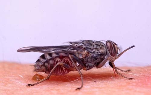 Η συγκεκριμένη μύγα έχει αναπτύξει μοναδικές και ασυνήθιστες βιολογικές μεθόδους για να μολύνει τα θύματά της, με τη βοήθεια και του άκρως εξελιγμένου αισθητηριακού συστήματός της, που βασίζεται τόσο στην όραση, όσο και στην οσμή. Ασυνήθιστη για έντομο είναι η αναπαραγωγή της (δεν γεννά αυγά, αλλά ήδη ανεπτυγμένα μικρά), η διατροφή της (τρέφεται μόνο με αίμα) και οι χρωματικές προτιμήσεις της (το μπλε και μαύρο χρώμα).