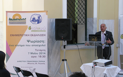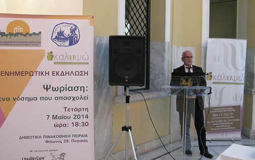 Η Εκδήλωση πραγματοποιήθηκε την Τετάρτη 7 Μαΐου 2014, ώρα 18:30 στη Δημοτική Πινακοθήκη Πειραιά (κτίριο Παλαιού Ταχυδρομείου) στον Πειραιά. Συντονιστής της εκδήλωσης ήταν ο κος Νικόλαος Σταυριανέας, Καθηγητής Δερματολογίας Πανεπιστημίου Αθηνών, ο οποίος ευχαρίστησε θερμά όλους τους παραβρισκόμενους, τους ομιλητές, το ΕΔΔΥΠΠΥ και το Δήμο Πειραιά για τη διοργάνωση. Ο κος Σταυριανέας κατά την εισαγωγική του ομιλία αναφέρθηκε στην πληθώρα ερευνών που διεξάγονται σε ετήσια βάση για την Ψωρίαση, οι οποίες έχουν επιφέρει σημαντική πρόοδο ως προς την αντιμετώπιση της νόσου. Οι ασθενείς θα πρέπει να αναζητούν ιατρική βοήθεια από τον ειδικό δερματολόγο άμεσα και να μην απογοητεύονται.