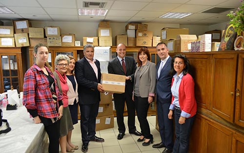 7. 000 σκευάσματα υψηλού κόστους αξίας μισού εκατομμυρίου ευρώ παρέδωσαν σήμερα στο Ιατρείο Κοινωνικής Αποστολής ο Διευθυντής Εταιρικών Υποθέσεων RocheHellas, κ. Κίμων Μαλαταράς, ο Ιατρικός Διευθυντής Roche Hellas, Δρ. Χρήστος Αντωνόπουλος και η Διευθύντρια Επιχειρησιακής Μονάδας Ογκολογίας, κα Ρενάτα Βαλσαμή.