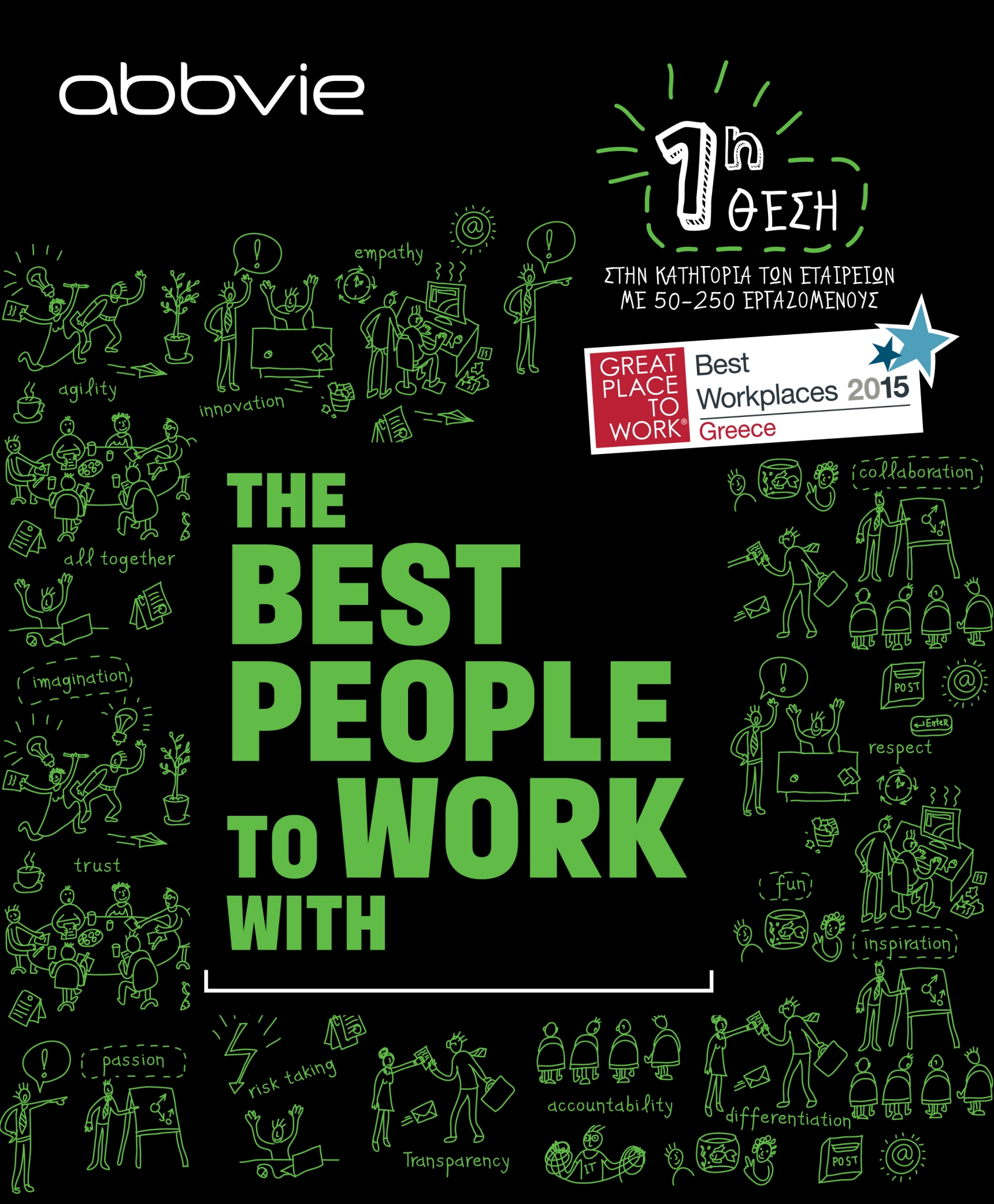 Η βιοφαρμακευτική εταιρεία AbbVie κατέκτησε την πρώτη θέση στη λίστα των εταιρειών με το καλύτερο εργασιακό περιβάλλον στην κατηγορία των επιχειρήσεων που απασχολούν 50 έως 250 εργαζόμενους, σύμφωνα με την ετήσια έρευνα Best WorkPlaces 2015.