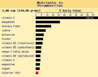 Πολύ φτωχή σε θερμίδες (35/100 γρ.), έχει σχετικά λίγα σάκχαρα, πολύ νερό (90%), ενώ διαθέτει πολλές βιταμίνες και ποικιλία θρεπτικών στοιχείων. Η φράουλα έχει πλούσια αντιοξειδωτική δράση, αρκεί να σκεφτεί κανείς μόλις 100γρ φράουλας (5-8 φράουλες) προσφέρουν περισσότερη από την ποσότητα βιταμίνης C που χρειαζόμαστε την ημέρα. ‘Όπως όλα τα φρούτα, έτσι και η φράουλα, περιέχει πολύ νερό (περίπου 90%), κάτι πολύ ευεργετικό για την ουροποιητική μας λειτουργία.