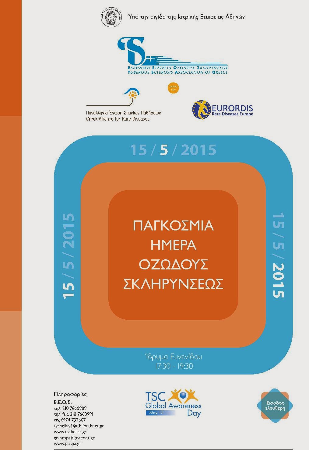 Η ημέρα αυτή είναι αφιερωμένη στην ενημέρωση των ασθενών, των επαγγελματιών υγείας αλλά και του ευρύτερου κοινού αναφορικά με την σπάνια πάθηση, Οζώδη Σκλήρυνση. Επιστήμονες θα ενημερώσουν σχετικά με την πάθηση και χιλιάδες ασθενείς και οι οικογένειες τους θα ενωθούν για να μοιραστούν με το κοινό την εμπειρία τους.Στο πλαίσιο των εορτασμών, η Ε.Ε.Ο.Σ. διοργανώνει ενημερωτική εκδήλωση στο Ίδρυμα Ευγενίδου, την Παρασκευή 15 Μαΐου 2015και ώρα 17:30, για την ενημέρωση του κοινού γύρω από την πάθηση, καθώς και συζήτηση γύρω από καίρια θέματα που απασχολούν τη διάγνωση, παρακολούθηση και θεραπευτική αντιμετώπισή της.Επιπλέον, η Ε.Ε.Ο.Σ., η Πανελλήνια Ένωση Σπανίων Παθήσεων και το Ίδρυμα Ευγενίδου πραγματοποιούν την ίδια ημέρα,Παρασκευή 15 Μαΐου 2015 και ώρα 20:00 στον εκθεσιακό χώρο του Ιδρύματος, τα εγκαίνια της αναδρομικής έκθεσης ζωγραφικής της Κατερίνας Λάμπρου, η οποία έπασχε από Οζώδη Σκλήρυνση και έφυγε από κοντά μας στις 28 Ιουνίου του 2009, με θέμα«Σπάνιος Ναι… Μόνος Όχι!».