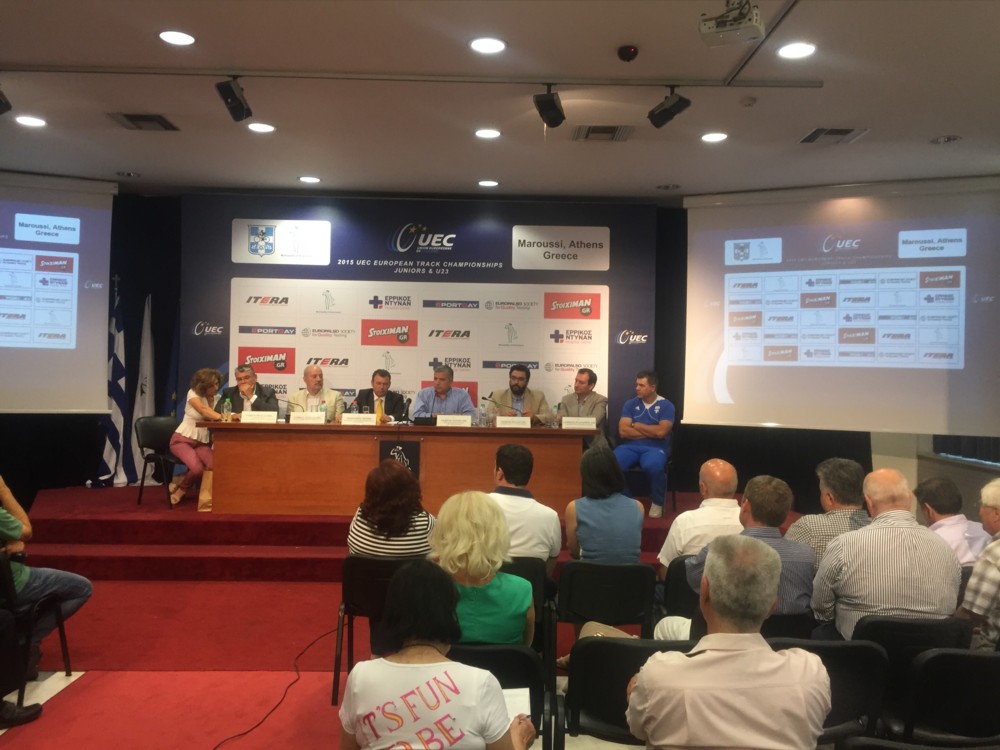 Για τη σπουδαιότητα της διοργάνωσης του Ευρωπαϊκού Πρωταθλήματος Ποδηλασίας στη χώρα μας σε μία ιδιαίτερα δύσκολη συγκυρία, αλλά και της διεξαγωγής αθλητικών διοργανώσεων διεθνούς εμβέλειας τοποθετήθηκαν στη συνέντευξη τύπου που παραχώρησαν ο Δήμαρχος Αμαρουσίου, Πρόεδρος της ΚΕΔΕ κ. Γιώργος Πατούλης, ο Πρόεδρος της Ελληνικής Ομοσπονδίας Ποδηλασία κ. Αθανάσιος Τερζής, ο Γεν. Γραμματέας της Ευρωπαϊκής Ένωσης Ποδηλασίας Enrico Della Casa, ο συντονιστής Γεν. Διευθυντής του ΟΑΚΑ κ. Σάββας Ανεστιάδης, ο προπονητής της Εθνικής Ομάδας Ποδηλασίας κ.Λάμπρος Βασιλόπουλος, ο Γεν. Γραμματέας της Γιουροπάλσο κ. Γεώργιος Παπαβαρσάλμης και ο εκπρόσωπος της Γεν. Γραμματείας Αθλητισμού κ. Γεώργιος Καλούσης.