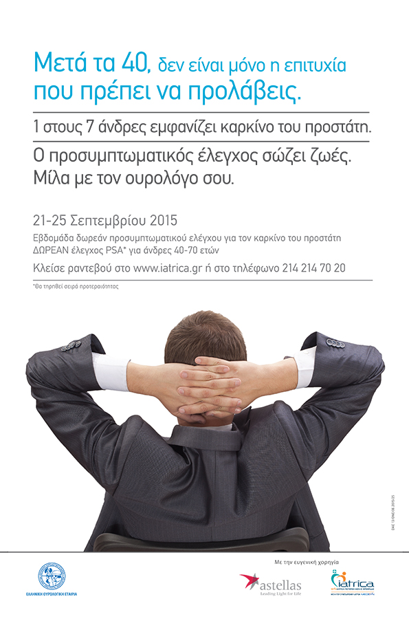 Το μήνυμα του προσυμπτωματικού ελέγχου είναι ιδιαίτερα σημαντικό για τον καρκίνο του προστάτη γι’ αυτό και η φετινή καμπάνια της ΕΟΕ, που πραγματοποιείται με την ευγενική χορηγία της φαρμακευτικής εταιρείας ASTELLAS και του δικτύου ιατρείων IATRICA, είναι μια καλή ευκαιρία για την ευαισθητοποίηση των ανδρών που συχνά παραμελούν ή αγνοούν τα οφέλη του προληπτικού ελέγχου για τη συγκεκριμένη νόσο.