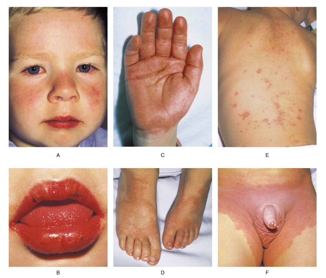 Υψηλός πυρετός για τουλάχιστον τέσσερις η μ έρες Τη δεύτερη μ ε τρίτη μ έρα του πυρετού παρουσιάζει επιπεφυκίτιδα ( κοκκίνισ μ α των μ ατιών χωρίς ό μ ως να τρέχει πύο ( χωρίς να τσι μ πλιάζουν ) από τα μ άτια ). Πρησ μ ένα και κόκκινα χέρια ( κάτω από τον καρπό ) και πόδια ( κάτω από τους αστραγάλους ) στην αρχή της νόσου , ακολουθού μ ενα από ξεφλούδισ μ α του δέρ μ ατος των δακτύλων . Εξάνθη μ α ε μ φανίζεται στο σώ μ α του παιδιού και στα γεννητικά του όργανα . Αλλοιώσεις στο στό μ α , όπως ξηρά , κόκκινα , σκασ μ ένα χείλη , ερυθρότητα στο στό μ α και / ή στο λάρυγγα , Γλώσσα πρησ μ ένη , κόκκινη που μ οιάζει μ ε φράουλα (μ οροειδής γλώσσα ). Λε μ φοζίδιο . Διογκω μ ένος λε μ φαδένας στον λαι μ ό ( συνήθως ένας ) δια μ έτρου τουλάχιστον 1,5 εκατοστού