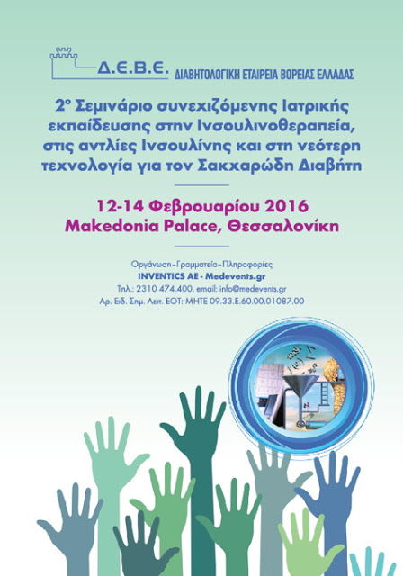 H Διαβητολογική Εταιρεία Βόρειας Ελλάδας διοργανώνει Επιστημονικό Σεμινάριο υψηλού επιπέδου με θέμα «2ο Σεμινάριο Συνεχιζόμενης Ιατρικής Εκπαίδευσης στην Ινσουλινοθεραπεία, στις Αντλίες ινσουλίνης και στη Νεότερη τεχνολογία για τον Σακχαρώδη Διαβήτη», το οποίο θα πραγματοποιηθεί στην Θεσσαλονίκη, 12 – 14 Φεβρουαρίου 2016 (ξενοδοχείο Makedonia Palace).
