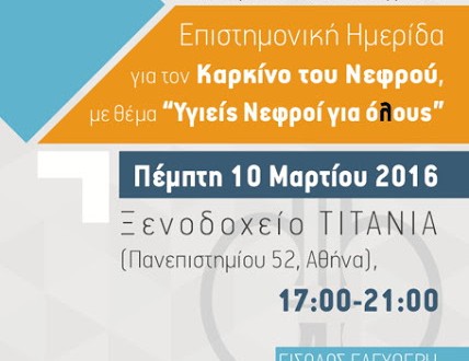 Ο Σύλλογος Καρκινοπαθών – Εθελοντών – Φίλων – Ιατρών «Κ.Ε.Φ.Ι.» Αθηνών, με αφορμή την Παγκόσμια Ημέρα για τον Καρκίνο του Νεφρού στις 10 Μαρτίου και σε μια προσπάθεια ενημέρωσης και ευαισθητοποίησης για τη νόσο, διοργανώνει Επιστημονική Ημερίδα την Πέμπτη 10 Μαρτίου 2016 και ώρα 17:00 – 21:00, στο Ξενοδοχείο ΤΙΤΑΝΙΑ, με είσοδο ελεύθερη για το κοινό.