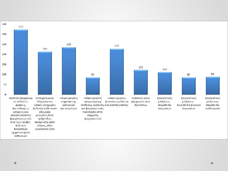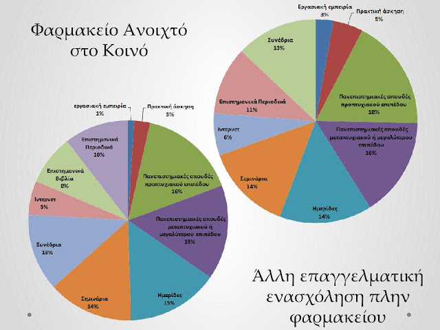 Η τελευταία ερώτηση αφορά το αντικείμενο επιμορφωτικού ενδιαφέροντος των φαρμακοποιών και εδώ οι απαντήσεις ποικίλουν, με την πιο δημοφιλή να είναι η διάθεση φαρμάκων σε ασθενείς, οι δράσεις, ανεπιθύμητες ενέργειες και αλληλεπιδράσεις φαρμάκων μεταξύ τους ή με τροφές, οι ασθενείς πολλαπλών σχημάτων ή και ασθενειών.