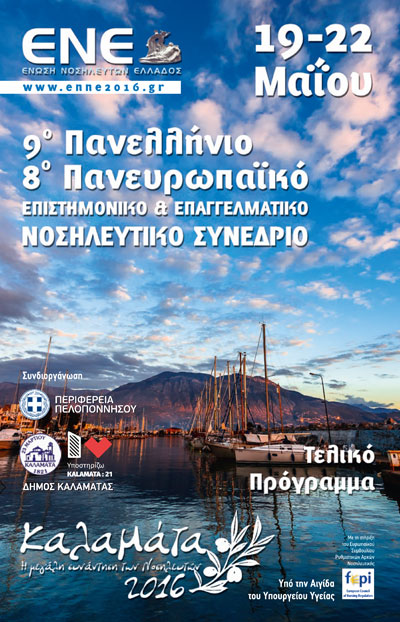 Τελικό Πρόγραμμα του 9ου Πανελλήνιου και 8ου Πανευρωπαϊκού Επιστημονικού & Επαγγελματικού Νοσηλευτικού Συνεδρίου της Ένωσης Νοσηλευτών Ελλάδος που πραγματοποιείται φέτος στην Καλαμάτα από 19 έως 22 Μαΐου 2016.