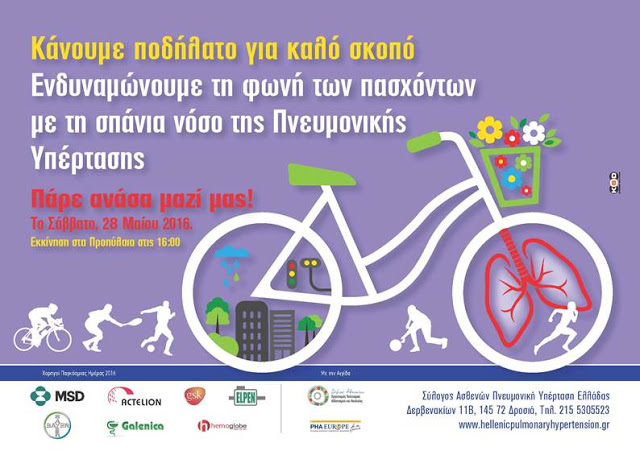 Η ποδηλατική βόλτα αποτελεί κορύφωση των ενεργειών του Συλλόγου Ασθενών «Πνευμονική Αρτηριακή Υπέρταση Ελλάδας», με αφορμή την Παγκόσμια Ημέρα Πνευμονικής Αρτηριακής Υπέρτασης (5 Μαΐου). Η Actelion Pharmaceuticals Hellas, πρωτοπόρος στην παροχή ολοκληρωμένων και καινοτόμων θεραπευτικών λύσεων για την αντιμετώπιση της νόσου, στέκεται διαχρονικά στο πλευρό του συλλόγου, υποστηρίζοντας και τις επερχόμενες δράσεις του.