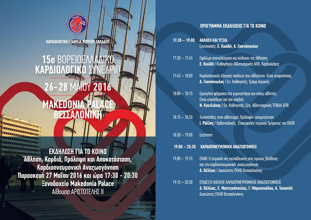 Νέοι, παιδιά και άθληση, οφέλη για την υγεία, συνέπειες από την υπερβολική σωματική δραστηριότητα και την ενδεχόμενη λήψη «ουσιών», κατάλληλες προϋποθέσεις, καθώς επίσης πρόληψη από τα εμφράγματα και τις καρδιοπάθειες, αποτελούν το επίκεντρο της εκδήλωσηςενημέρωσηςκοινού που διοργανώνει για πρώτη φορά φέτος η Καρδιολογική Εταιρεία Βορείου Ελλάδος στις 27 Μαΐου 2016 στο ξενοδοχείοMakedonia Palace στη Θεσσαλονίκη.