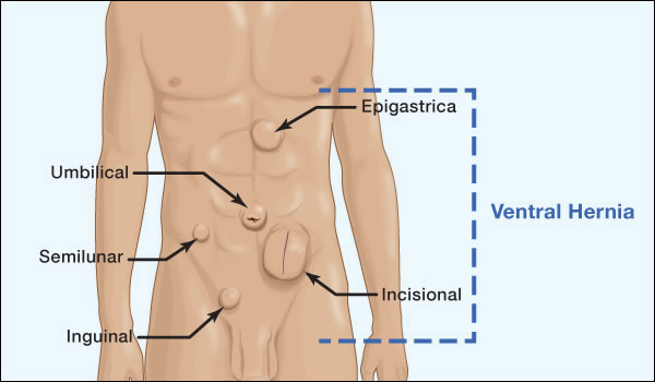 •Επιγαστρική κήλη, στο επιγάστριο, δηλαδή πάνω από τον ομφαλό
