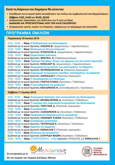 Την Παρασκευή 10 και το Σάββατο 11 Ιουνίου, από τις 09.00 το πρωί έως τις 20.00 το βράδυ, διακεκριμένοι επιστήμονες θα εξηγήσουν πώς γίνεται η διάγνωση του μελανώματος, τι κινδύνους κρύβει για την υγεία, ποια είναι τα νεότερα στη θεραπευτική αντιμετώπιση, ποιοι κινδυνεύουν περισσότερο, ενώ θα απαντήσουν σε ερωτήσεις των παρευρισκομένων. Επιπλέον, δερματολόγοι της ΕΛ.Ε.Μ.ΜΕΛ. θα «εκπαιδεύουν» τους ενδιαφερόμενους για το σωστό τρόπο αυτοεξέτασης, εξηγώντας, παράλληλα, ποιες αλλαγές στις ελιές (μορφή, χρώμα, κνησμός κ.λπ.) χρήζουν προσοχής.