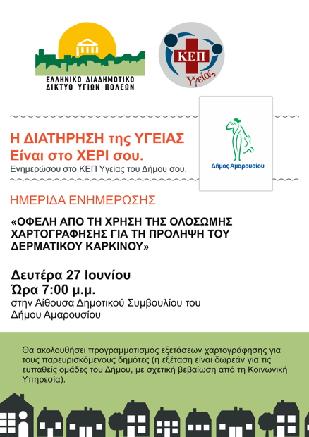 Ημερίδα ενημέρωσης και ευαισθητοποίησης για την πρόληψη του δερματικού καρκίνου διοργανώνει ο Δήμος Αμαρουσίου, σε συνεργασία με το Κέντρο Πρόληψης Υγείας (ΚΕΠ) και το Ελληνικό Διαδημοτικό Δίκτυο Υγιών Πόλεων.