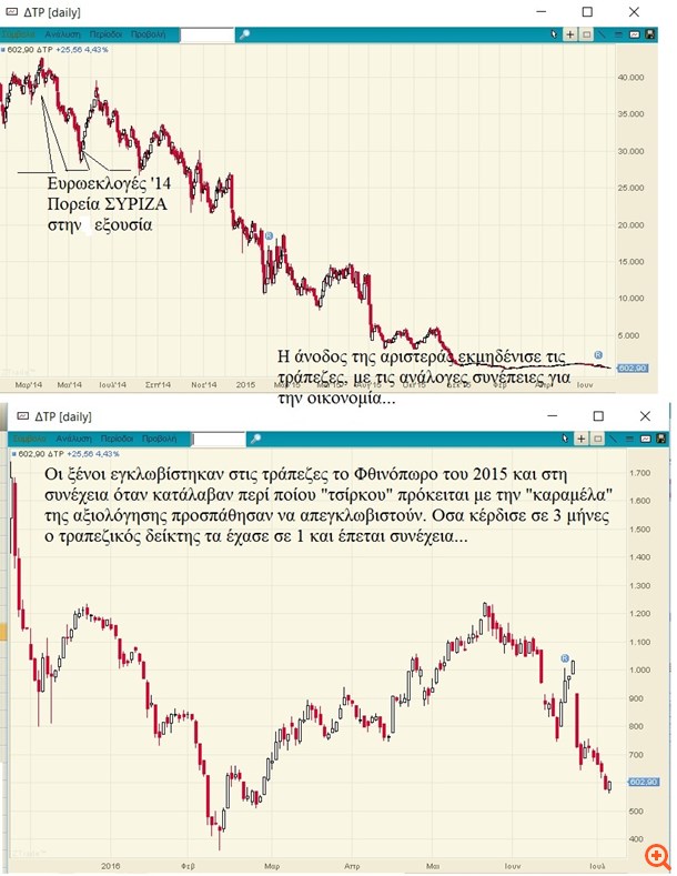 Αυτό εκφράστηκε ως εξής στο χρηματιστήριο. Ο τραπεζικός δείκτης από το Φεβρουάριο μέχρι το Μάιο που ολοκληρώθηκε η αξιολόγηση κινήθηκε από τις 400 στις 1.200 μονάδες. Ένα μήνα μετά είχε επιστρέψει κάτω από τις 600 και οι προοπτικές, με βάση τις εσωτερικές αλλά και τις διεθνείς πλέον εξελίξεις, δεν είναι ευοίωνες.