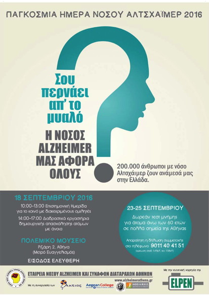 Στο πλαίσιο της Παγκόσμιας Ημέρας Νόσου Αλτσχάιμερ (21 Σεπτεμβρίου) η Εταιρεία Nόσου Alzheimer Αθηνών σε συνεργασία με το Aegean College, τη Μονάδα Φροντίδας Ηλικιωμένων ‘Ακτιος, το Κέντρο Ημέρας ΙΑΣΙΣ και το Κοινωνικό Ιατρείο ALZHEIMERS΄ Πειραιά- ΕΚΨΥΕ καθώς και τη συμβολή της Περιφέρειας Δυτικής Ελλάδας, διοργανώνει τις παρακάτω εκδηλώσεις: