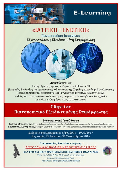 Τελευταίες μέρες εγγραφών για το 9μηνο πρόγραμμα εξ αποστάσεως εξειδικευμένης επιμόρφωσης «Ιατρική Γενετική», το οποίο υλοποιεί το Κέντρο Δια Βίου Μάθησης του Πανεπιστημίου Ιωαννίνων.
