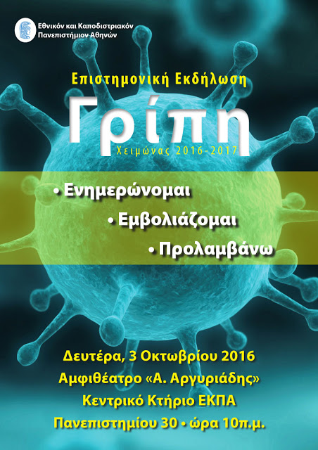 Απαντήσεις σε όλα τα ερωτήματα σχετικά με τον ιό της γρίπης από τους πλέον ειδικούς σε θέματα Παθολογίας, Λοιμώξεων, Μικροβιολογίας, Επιδημιολογίας και Προληπτικής Ιατρικής, καθώς και χρήσιμες συμβουλές για την αντιμετώπιση του ιού ενόψει της χειμερινής περιόδου 2016-2017 θα δοθούν σε ειδική επιστημονική εκδήλωση που οργανώνει το Εθνικό και Καποδιστριακό Πανεπιστήμιο Αθηνών τη Δευτέρα 3 Οκτωβρίου και ώρα 10π.μ., στο Αμφιθέατρο «Α. Αργυριάδης» του ιστορικού Κεντρικού Κτηρίου (Πανεπιστημίου 30).
