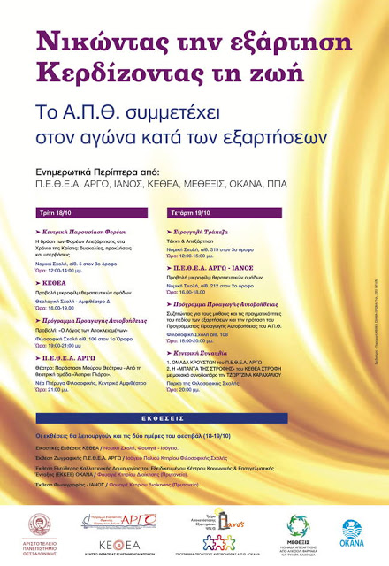 Το ΑΠΘ ανοίγει τις πόρτες του στο ΚΕΘΕΑ και άλλους φορείς απεξάρτησης στις 18 και 19 Οκτωβρίου 2016 για ένα πλούσιο διήμερο καλλιτεχνικών δράσεων και ανοικτών συζητήσεων που απευθύνονται στη φοιτητική κοινότητα αλλά και σε ολόκληρη την πόλη της Θεσσαλονίκης. Φοιτητές και κοινό θα έχουν τη δυνατότητα να συναντηθούν με μέλη, στελέχη και εθελοντές των φορέων απεξάρτησης σε διαφορετικούς χώρους του ΑΠΘ, όπου θα δημιουργηθούν για δύο μέρες «εστίες» τέχνης,ενημέρωσης και ανταλλαγής απόψεων.