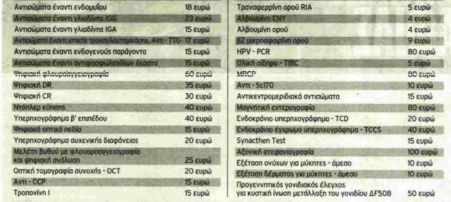 Το «Εθνος» παρουσιάζει σήμερα το σύνολο των εξετάσεων αυτών, με τις τιμές που θα αποζημιώνονται από τον ΕΟΠΥΥ και επί των οποίων θα πληρώνουν οι ασφαλισμένοι τη συμμετοχή τους (15%). Μεταξύ των εξετάσεων που κοστολογήθηκαν για πρώτη φορά είναι η ψηφιακή μαστογραφία, το υπερηχογράφημα αυχενικής διαφάνειας και δευτέρου επιπέδου, ο προγεννητικός γονιδιακός έλεγχος για κυστική ίνωση, η εξέταση για τον ιό των ανθρώπινων κονδυλωμάτων (HPV), η αξονική στεφανιογραφία, το κολπικό υπερηχογράφημα και η μοριακή εξέταση (PCR) για τη γρίπη τύπου Α (Η1Ν1).