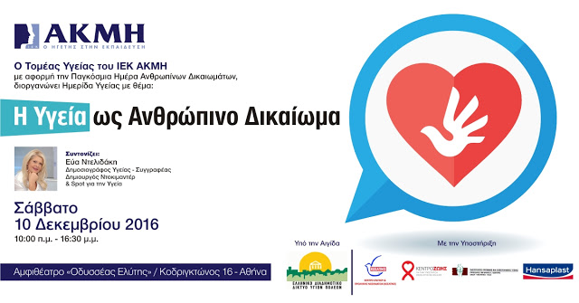 Με αφορμή την Παγκόσμια Ημέρα για τα Ανθρώπινα Δικαιώματα, η οποία τιμάται στις 10 Δεκεμβρίου, ο Τομέας Υγείας του ΙΕΚ ΑΚΜΗ στην Αθήνα και στον Πειραιά διοργανώνει Ημερίδα Υγείας.
