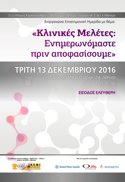 Ο Σύλλογος Καρκινοπαθών-Εθελοντών-Φίλων-Ιατρών «Κ.Ε.Φ.Ι.» Αθηνών διοργανώνει Επιστημονική Ημερίδα, την Τρίτη 13 Δεκεμβρίου 2016 και ώρα 17:00-20:00, στον Πολυχώρο IANOS (Σταδίου 24, Αθήνα), με είσοδο ελεύθερη για το κοινό.