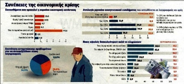 Την ίδια στιγμή, το 34% του πληθυσμού ξοδεύει περίπου το 75% των εισοδημάτων του για την κάλυψη λογαριασμών και χρεών και το 15% ξοδεύει το σύνολο του εισοδήματός του για τους ίδιους λόγους. Μάλιστα, ποσοστό 33,13% αντιμετωπίζει αρκετές ή σοβαρές οικονομικές δυσκολίες με αποτέλεσμα να αδυνατεί να αντεπεξέλθει σε οφειλές και λογαριασμούς.