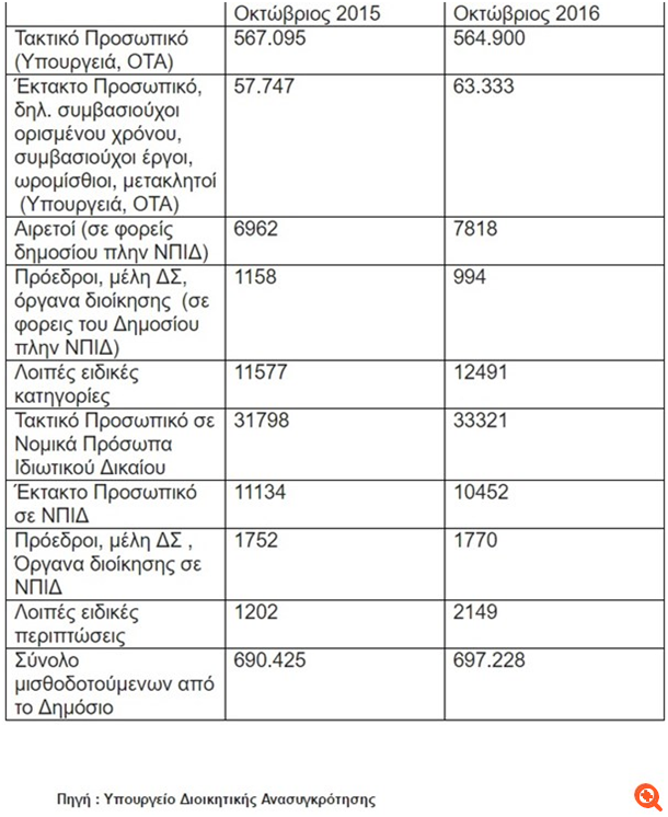 Πιο συγκεκριμένα, σύμφωνα με τα στοιχεία του Υπ. Διοικητικής Ανασυγκρότησης, το σύνολο το μισθοδοτούμενων από το Δημόσιο έφτασε στους 697.228 ενώ τον Οκτώβριο του 2015 ανερχόταν στους 690.425.