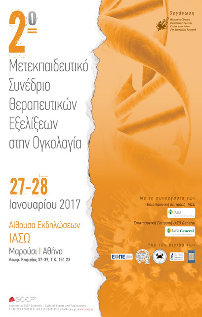 Το «2ο Μετεκπαιδευτικό Συνέδριο Θεραπευτικών Εξελίξεων στην Ογκολογία» διοργανώνεται από την Παγκρήτια Ένωση Βιοϊατρικής Έρευνας σε συνεργασία με τις Επιστημονικές Επιτροπές του ΙΑΣΩ και του ΙΑΣΩ General, την Παρασκευή 27/01/17 ώρα 11:30, και το Σάββατο 28/01/17 ώρα 09:20 στην Αίθουσα Εκδηλώσεων της Κλινικής ΙΑΣΩ (Λεωφ. Κηφισίας 37-39, Μαρούσι). Το συνέδριο τελεί υπό την αιγίδα της Εταιρείας Ογκολόγων Παθολόγων Ελλάδας, της Ελληνικής Ογκολογικής Ερευνητικής Ομάδας, της Ελληνικής Εταιρείας Ακτινοθεραπευτικής Ογκολογίας, της Ελληνικής Εταιρείας Παθολογικής Ανατομικής και της Ελληνικής Εταιρείας Χειρουργικής Ογκολογίας.