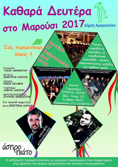 Ο Δήμος Αμαρουσίου προσκαλεί μικρούς και μεγάλους να γιορτάσουμε μαζί παραδοσιακά την Καθαρά Δευτέρα και να καλωσορίσουμε την Σαρακοστή, στο Κλειστό Γυμναστήριο «Σπύρος Λούης» ( Βασ. Όλγας 12, Σταθμός ΗΣΑΠ), τη Δευτέρα 27 Φεβρουαρίου 2017 από τις 12:00 το μεσημέρι.