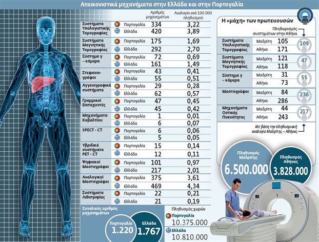 Πλούσιο «οπλοστάσιο» ιατρικής τεχνολογίας δείχνουν τα στοιχεία που αφορούν την Ελλάδα και την Πορτογαλία, με τη χώρα μας να κατέχει την πρώτη θέση στον συνολικό αριθμό μηχανημάτων (δημόσιου και ιδιωτικού τομέα).