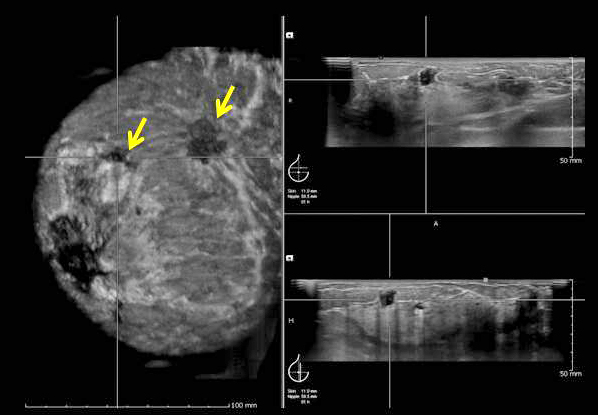 Η μαστογραφική ανίχνευση τού καρκίνου είναι αντιστρόφως ανάλογη της πυκνότητας του μαστού αλλά βελτιώνεται σημαντικά με τη συμβολή της υπερηχογραφίας ακόμη και σε μικρού μεγέθους μάζες.