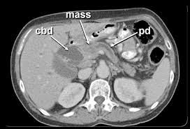 • Το αδενοκαρκίνωμα της κεφαλής του παγκρέατος αναδεικνύεται από τυχόν χολοστατικό ίκτερο , που δημιουργείται βαθμιαία χωρίς πυρετό ή πόνο. Μερικές φορές ο ίκτερος, που εμφανίζεται νωρίς ή αργότερα συνδέεται με έντονο πόνο, που εντοπίζεται κυρίως στο επιγάστριο, ακτινοβολεί στην πλάτη και την γενική εξασθένιση του οργανισμού που οφείλεται στην απώλεια της όρεξης και που συχνά συνδέεται με κατάθλιψη.Ο ίκτερος μπορεί να ακολουθεί μια ανικτερική χολόσταση που συνδέεται με κνησμό. Ο γιατρός μπορεί να ψηλαφήσει διόγκωση του ήπατος λόγω χολόστασης και ιδίως μια μεγάλη διατεταμένη χοληδόχο κύστη που έχει σημαντική διαγνωστική αξία.