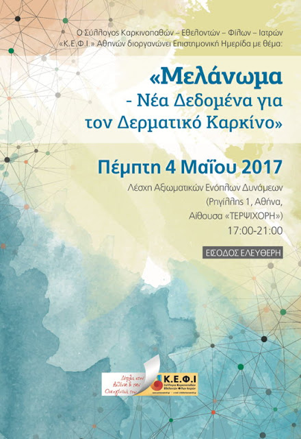 Ο Σύλλογος Καρκινοπαθών-Εθελοντών-Φίλων-Ιατρών «Κ.Ε.Φ.Ι.» Αθηνώνδιοργανώνει Επιστημονική Ημερίδα, την Πέμπτη 4 Μαΐου2017 και ώρα 17:00–21:00, στην Λέσχη Αξιωματικών Ενόπλων Δυνάμεων (Ρηγίλλης 1, Αθήνα – ΑΙΘΟΥΣΑ «ΤΕΡΨΙΧΟΡΗ), με είσοδο ελεύθερη για το κοινό.