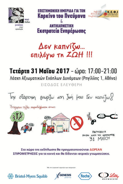 Με αφορμή την Παγκόσμια Ημέρα κατά του Καπνίσματος, ο Σύλλογος Καρκινοπαθών-Εθελοντών-Φίλων-Ιατρών «Κ.Ε.Φ.Ι.» Αθηνών και οι Γυναίκες στην Ογκολογία-W4O, σε συνεργασία με την Πνευμονολογική Κλινική του Νοσοκομείου Γ.Α.Ν.Α. «Ο ΑΓΙΟΣ ΣΑΒΒΑΣ», διοργανώνουν Επιστημονική Ημερίδα, την Τετάρτη 31 Μαΐου 2017 και ώρα 17:00-21:00, στην Λέσχη Αξιωματικών Ενόπλων Δυνάμεων (Ρηγίλλης 1, Αθήνα), με είσοδο ελεύθερη για το κοινό.