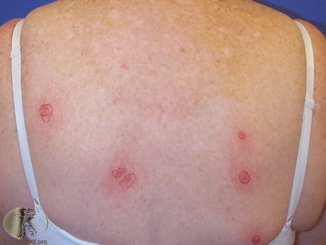 Μια ερυθρόμορφη κηλίδα ή ερεθισμένη περιοχή συχνά εμφανίζεται στο πρόσωπο, στήθος, ώμο, χέρια ή στα πόδια. Μερικές φορές η βλάβη δημιουργεί κρούστα. Επίσης μπορεί να εμφανιστεί κνησμός ή πόνος και άλλες φορές να επιμένει χωρίς ενοχλήσεις.