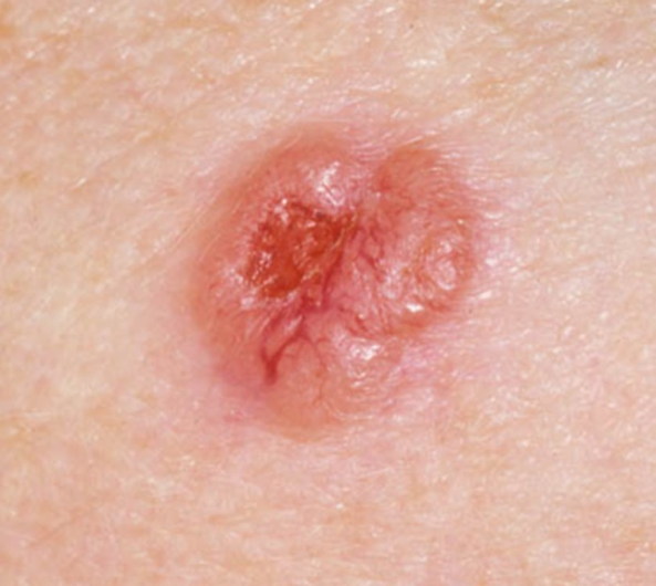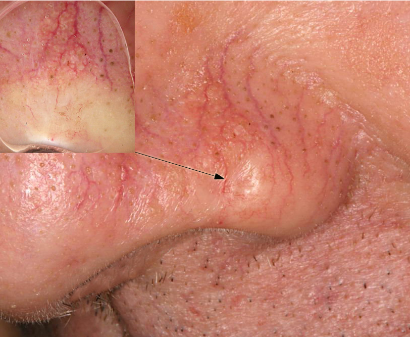 Ένα γυαλιστερό έπαρμα ή οζίδιο που είναι διαυγές ή μαργαριταροειδές και πολλές φορές είναι ροζ, κόκκινο ή λευκό. Το οζίδιο μπορεί επίσης να είναι μαύρο, ηλιοκαμένο ή καφέ, ειδικά σε άτομα με σκουρόχρωμα μαλλιά και μπορεί να συγχέεται με κανονικό σπίλο.