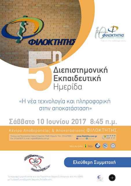 Η 5Η Διεπιστημονική Εκπαιδευτική Ημερίδα με θέμα «Η νέα τεχνολογία και πληροφορική στην Αποκατάσταση» διοργανώνεται από το Κέντρο Αποθεραπείας-Αποκατάστασης ΦΙΛΟΚΤΗΤΗΣ και την Ελληνική Εταιρεία Εργοσπειρομετρίας, Άσκησης και Αποκατάστασης–ΕΛΕΡΓΑ. Η Ημερίδα θα διεξαχθεί το Σάββατο 10 Ιουνίου 2017,στην Αίθουσα Εκδηλώσεων του ΦΙΛΟΚΤΗΤΗ (Πεύκων και Πεισιστράτου, Καρελλάς-Κορωπί).
