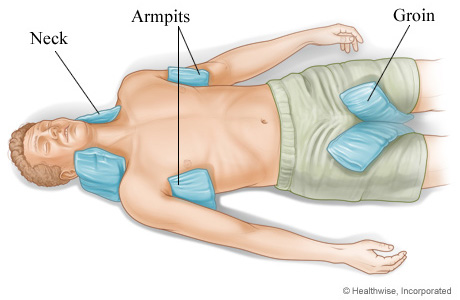 - Του βρέχουμε το πρόσωπο, το λαιμό και το στήθος με κρύο νερό. Ψεκάστε το σώμα με δροσερό νερό (150C). Η χρήση πάγου είναι καλό να αποφεύγεται αλλά θα πρέπει να επιχειρείται αν η θερμοκρασία δεν πέφτει.