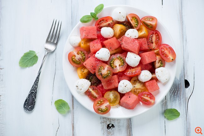 Η φύση λοιπόν έχει έναν ιδιαίτερο τρόπο να παρέχει τα κατάλληλα εργαλεία για την προστασία μας, παρέχοντάς μας έναν σημαντικό αριθμό τροφίμων που προστατεύουν από τον ήλιο και που είναι διαθέσιμα κυρίως τους καλοκαιρινούς μήνες. Καταναλώστε φρούτα και λαχανικά κόκκινου και πορτοκαλί χρώματος όπως είναι το καρότο, η τομάτα, το καρπούζι αλλά και διάφορα berries κόκκινου ή παραπλήσιων χρωμάτων. Οι συγκεκριμένες τροφές είναι πλούσιες σε λυκοπένιο λουτεΐνη, ζεαξανθίνη και β-καροτένιο και έτσι μετατρέπονται σε “αντηλιακά” με υψηλό δείκτη προστασίας! Επιπλέον, το ταχίνι και το φυστικοβούτυρο είναι τρόφιμα πλούσια σε πολυακόρεστα λιπαρά οξέα και αντιοξειδωτικά συστατικά, απαραίτητα για την ανάπλαση του δέρματος. Βάλτε ταχίνι ή φυστικοβούτυρο στο πρωινό γεύμα ή ως σνακ κατά τη διάρκεια της ημέρας και ενισχύστε την επιδερμίδα σας με ένα ακόμη όπλο. Τέλος, προτιμήστε τα πράσινα φυλλώδη λαχανικά. Η γνωστή σε όλους μας γλιστρίδα είναι επίσης πλούσια σε λιπαρά οξέα και φυτικές ίνες που μπορούν να συμβάλλουν στη μείωση του ρυθμού εμφάνισης ρυτίδων και του κινδύνου εμφάνισης καρκίνου του δέρματος.