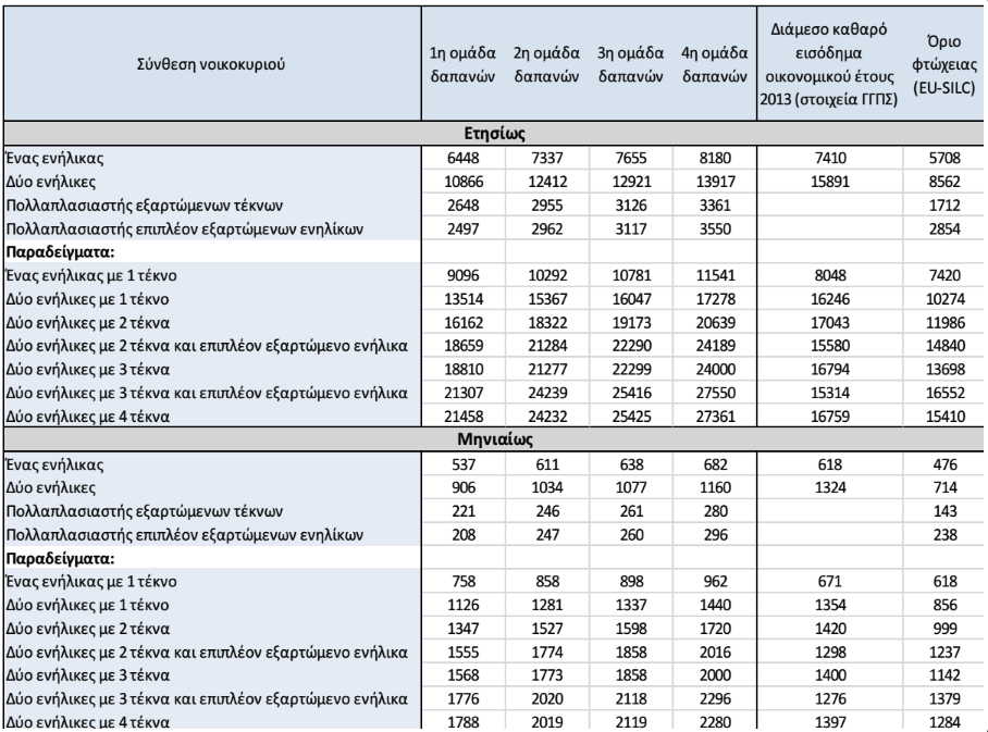 Σύμφωνα με τον παραπάνω πίνακα του Υπουργείου Ανάπτυξης, οι βασικές εύλογες δαπάνες διαβίωσής της οικογένειας του εν λόγω αυταπασχολούμενου ανέρχονται σε 16.162 ευρώ ανά έτος ή 1346 ευρώ ανά μήνα.