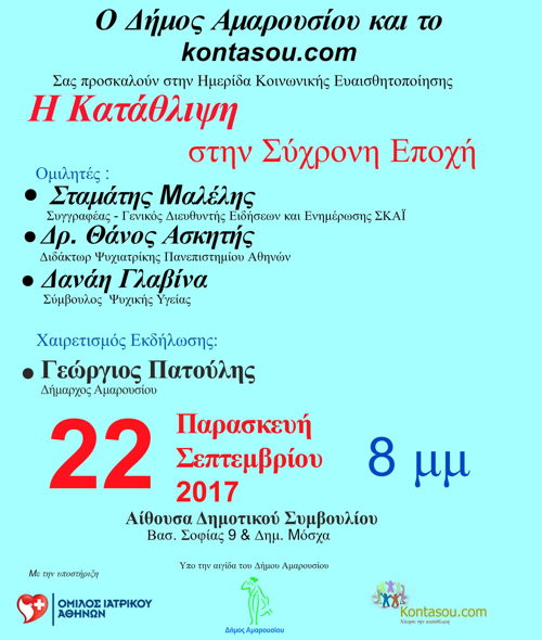 «Η κατάθλιψη στη σύγχρονη εποχή» είναι το θέμα της ημερίδας που διοργανώνει το Kontasou.com σε συνεργασία με το Δήμο Αμαρουσίου, την Παρασκευή 22 Σεπτεμβρίου 2017 και ώρα 08:00 μ.μ. στο Δημαρχείο Αμαρουσίου (Βασ. Σοφίας 9 & Δ. Μόσχα).
