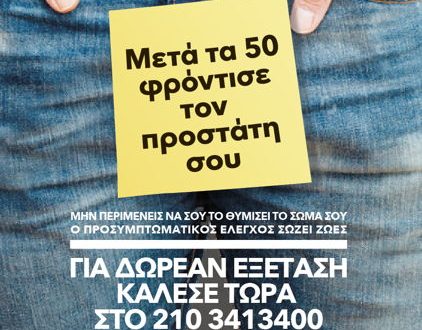 Κατά τη διάρκεια της εκστρατείας, θα πραγματοποιείται δωρεάν προσυμπτωματικός έλεγχος για τη νόσο, με την εξέταση του Ειδικού Προστατικού Αντιγόνου (PSA). Για την δωρεάν εξέταση, οι ενδιαφερόμενοι μπορούν να επικοινωνούν με το τηλέφωνο 210 3413400.